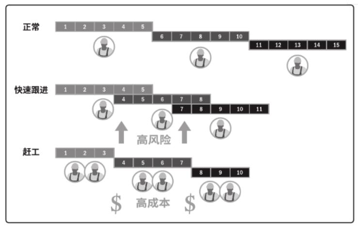 赶工:通过增加资源,以最小的成本代价来压缩进度工期的一种技术。