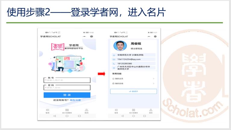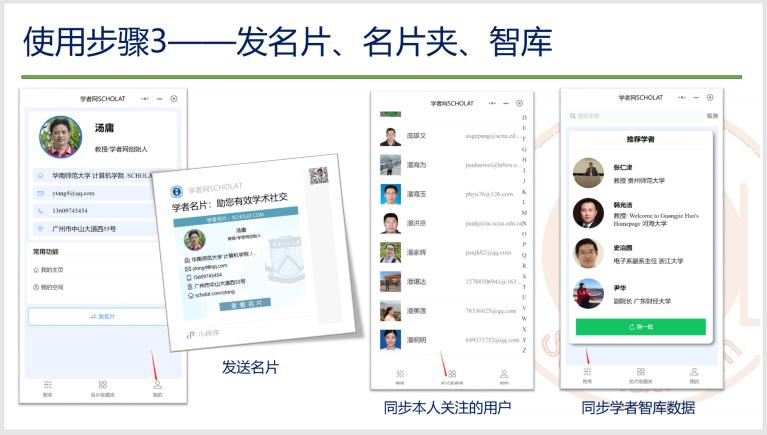 学者名片小程序正式上线。相对现有电子名片系统,除了具有将联系信息保存到手机通信录功能外,还有两个重要特点:1)同步学者网个人空间“关注的学者”数据,无需本地收藏;2)如果您及时完善您的学者主页,对方通过名片访问您的个人主页,可全面了解您的学术信息,以便更有效的学术交流。