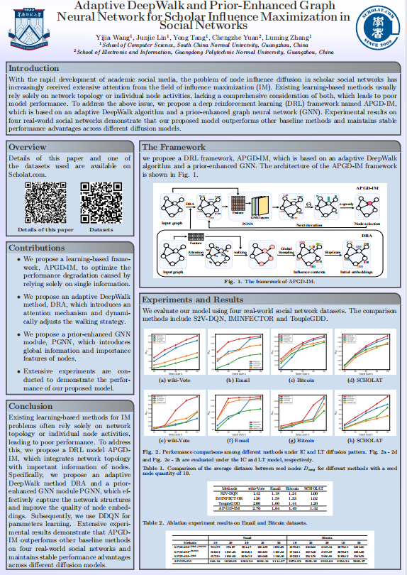 在2024年7月12日至14日,SCHOLAT团队于内蒙古呼和浩特参加了由中国计算机学会主办,协同计算专业委员会和内蒙古大学承办的第19届全国计算机支持的协同工作与社会计算学术会议(ChineseCSCW2024)。感谢全国计算机支持的协同工作与社会计算学术会议组织委员会的认可和支持,我非常荣幸能够获得本次会议的“最佳学生论文奖”,特别感谢汤庸老师和袁成哲老师的指导,以及各位师兄师姐和同学们的帮助。论文题目为《Adaptive DeepWalk and Prior-Enhanced Graph Neural Network for Scholar Influence Maximization in Social Networks》,以下是论文的主要内容。