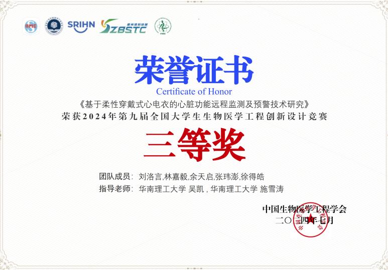 2023级刘洛言同学的团队成员基于柔性穿戴式心电衣,通过构建CNN-LSTM模型并使用SE-Net模块和医院联合采集的数据优化,进行心电信号远程检测与预警技术的研究。项目成功搭建了24小时实时心电信号检测系统,为辅助医生进行术后居家康复检测提供了技术支持。