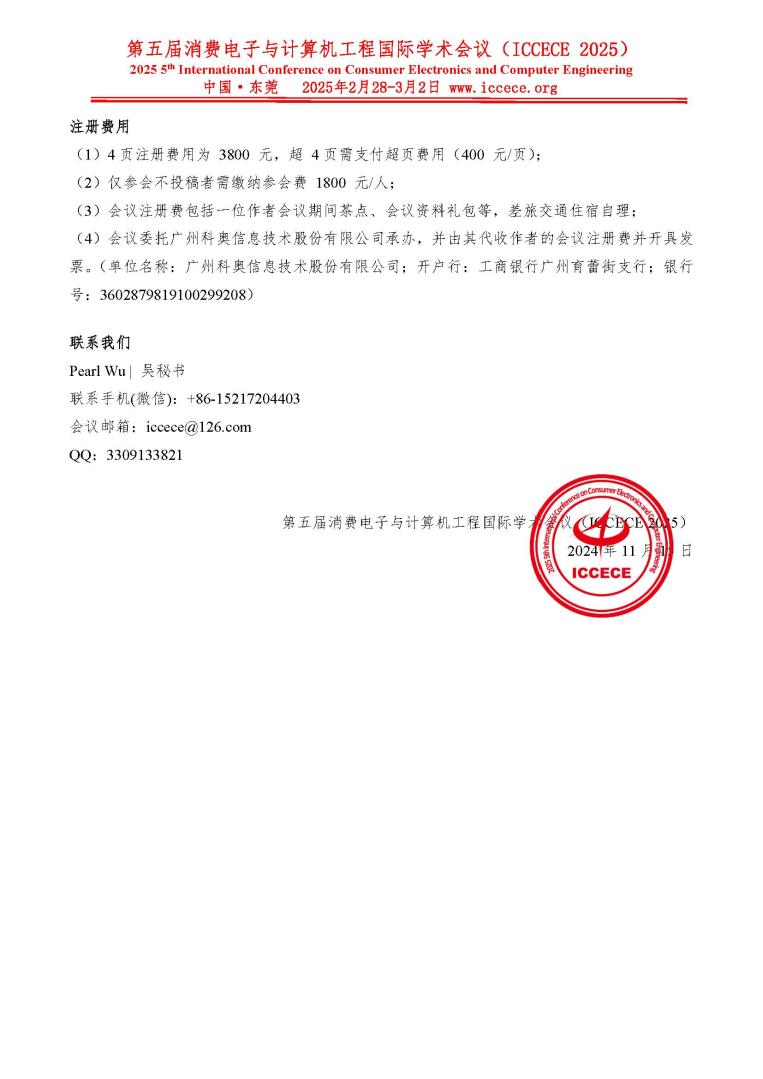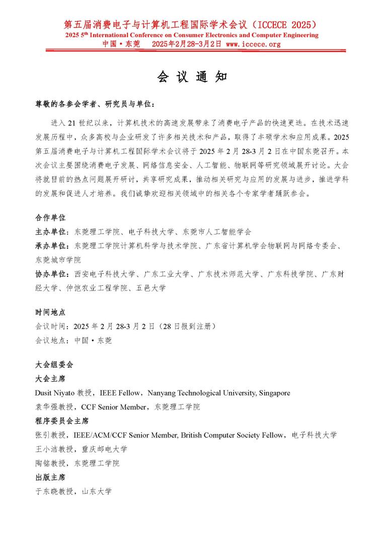 主要征稿方向:消费电子发展与应用、计算机与网络信息安全、人工智能与机器学习、物联网与传感器技术