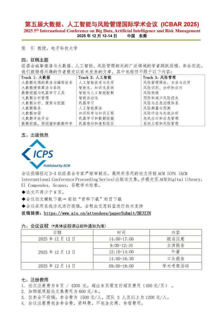 会议投稿经过2-3位组委会专家严格审核后,最终所录用的论文将被ACM ICPS (ACM International Conference Proceeding Series)出版论文集,并提交至ACM Digital library,EI Compendex, Scopus,谷歌学术检索。